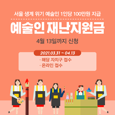 해당 사업은 정부 지원 사업이 아닌 서울시 지원사업이기 때문에 자세한 사항은 거주지 자치구 담당부서로 문의하시길 바랍니다. 이번 지원금으로 조금이나마 지친 예술인들에게 힘이 되었으면 하는 바람입니다.
