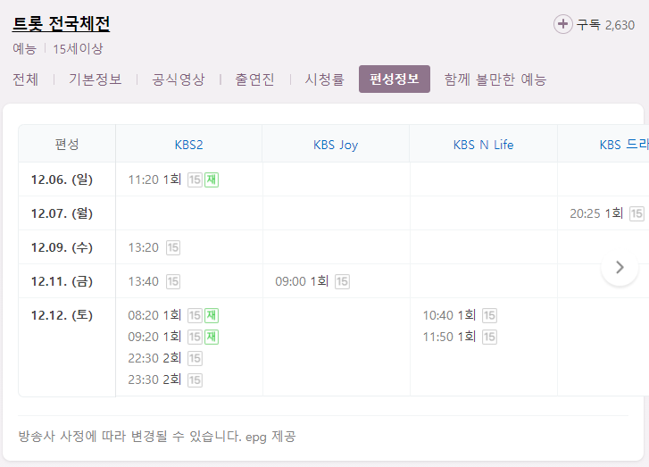 KBS 트롯 전국체전은 엄청난 인기인 만큼 KBS여러채널에서 계속해서 재방송을 해줄것으로 보여집니다. 매주 재방송 일정이 궁금하신 분은 아래 링크에서 확인하시면 됩니다.