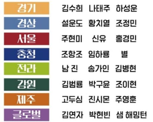 각 지역을 대표하는 감독은 서울 주현미, 경기 김수희, 강원 김범룡, 충청 조항조, 전라 남진, 경상 설운도, 제주 고두심, 글로벌 김연자로 8개지역입니다. 코치진도 있는데요. 신유, 홍경민, 나태주, 하성운, 박구윤, 조이현, 별, 송가인, 김병현, 조정민, 황치열, 진시몬, 주영훈, 박현빈, 샘해밍턴입니다.